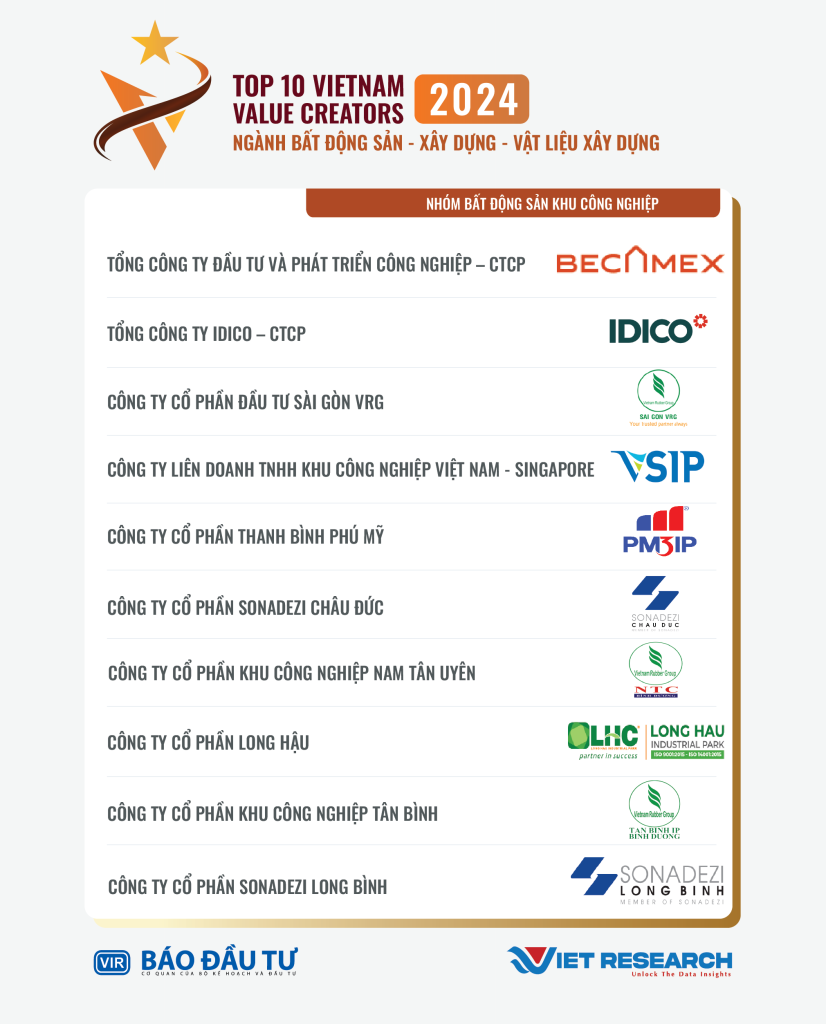 Danh sách 2: Top 10 Doanh nghiệp tạo giá trị hàng đầu Việt Nam 2024 nhóm Bất động sản khu công nghiệp