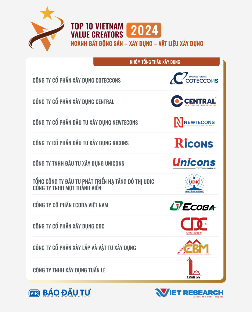 Nhằm ghi nhận và tôn vinh những nỗ lực này, Viet Research phối hợp cùng Báo Đầu tư thực hiện Chương trình Nghiên cứu toàn quốc về các Doanh nghiệp tạo giá trị hàng đầu Việt Nam, xác định và công bố danh sách Top 500 Doanh nghiệp tạo giá trị hàng đầu Việt Nam 2024 (Value500) và danh sách Top 10 Doanh nghiệp tạo giá trị hàng đầu Việt Nam 2024 ngành Bất động sản – Xây dựng – Vật liệu xây dựng (Value10) dựa trên việc nghiên cứu, đánh giá các chỉ tiêu đối với từng doanh nghiệp. Các nhóm tiêu chí bao gồm: Đánh giá về quy mô và tốc độ tăng trưởng; Đánh giá về lợi nhuận và đóng góp cho ngân sách; Đánh giá về tạo việc làm và thu nhập cho người lao động; Đánh giá về các tiêu chí ESG và đổi mới sáng tạo.