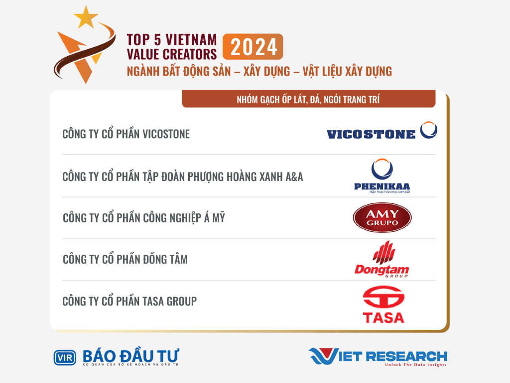Danh sách 6: Top 5 Doanh nghiệp tạo giá trị hàng đầu Việt Nam 2024 nhóm ngành Gạch ốp lát, Đá, Ngói trang trí