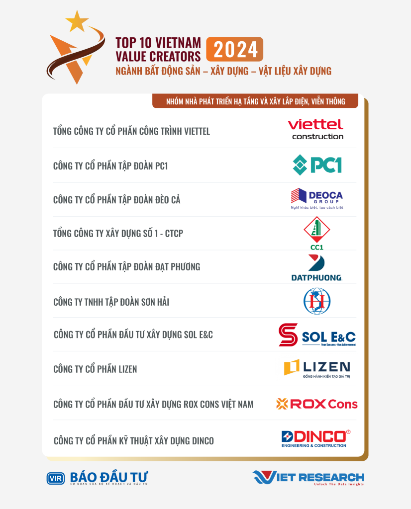 Danh sách 4: Top 10 Doanh nghiệp tạo giá trị hàng đầu Việt Nam 2024 nhóm Nhà phát triển hạ tầng và Xây lắp điện, viễn thông