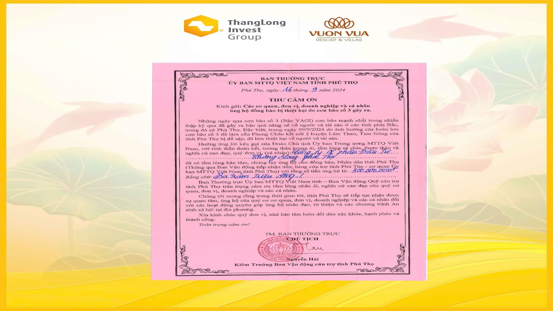 Ngày 16/9/2024, Tập đoàn Đầu tư Thăng Long (TIG), ), khu nghỉ dưỡng Vườn Vua Resort & Villas và các thành viên trong hệ sinh thái đã quyên góp 350 triệu đồng nhằm hỗ trợ các tỉnh miền Bắc bị ảnh hưởng nặng nề bởi cơn bão số 3 (YaGi). Đây là hành động thể hiện trách nhiệm xã hội và tinh thần sẻ chia của Tập đoàn đối với cộng đồng trong hoàn cảnh khó khăn.