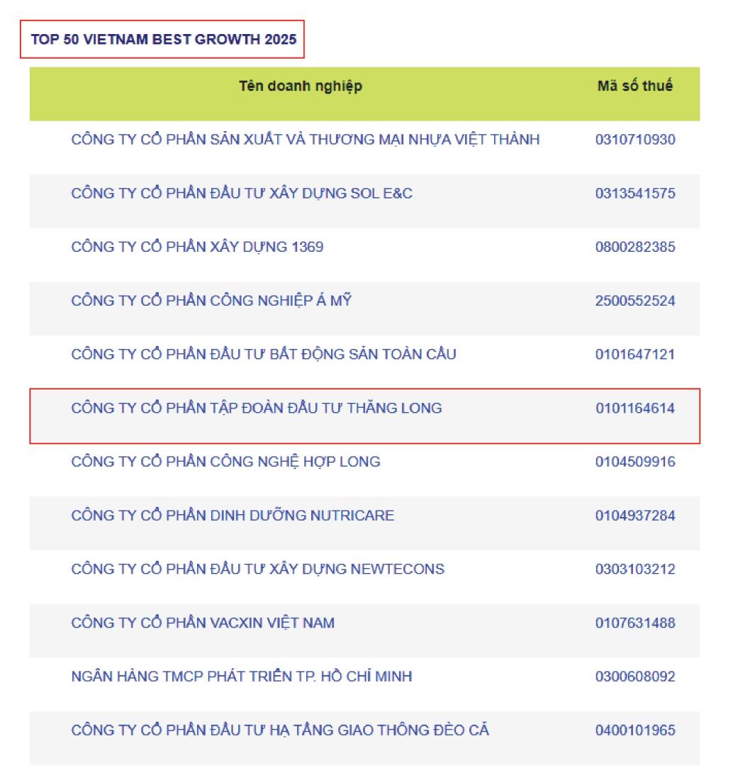 Theo công bố mới nhất ngày 10/3/2025, Tập đoàn Đầu tư Thăng Long (TIG) vinh dự được vinh danh Top 50 Doanh nghiệp tăng trưởng xuất sắc nhất Việt Nam năm 2025 (TOP 50 VIETNAM BEST GROWTH 2025) do Vietnam Report công bố. Đây cũng là năm thứ 5 liên tiếp TIG được ghi danh trong danh sách FAST500 - Top 500 Doanh nghiệp tăng trưởng xuất sắc nhất Việt Nam.