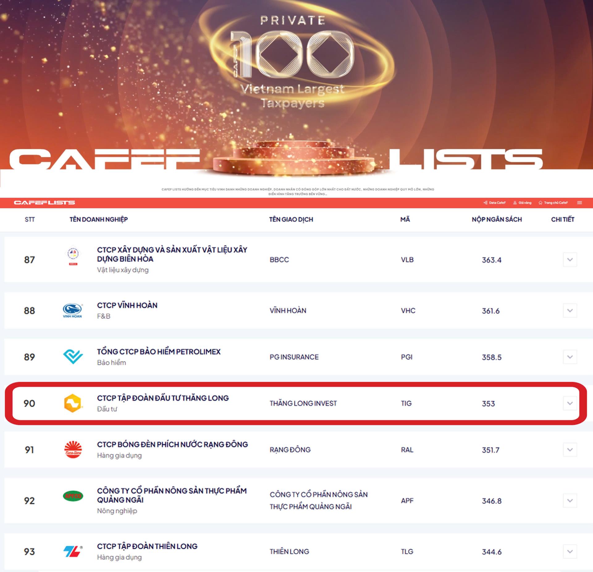 Theo công bố mới nhất từ CafeF, Tập đoàn Đầu tư Thăng Long (TIG) vinh dự góp mặt trong PRIVATE 100 – LEADING GROUP, Top 100 Doanh nghiệp tư nhân nộp ngân sách lớn nhất Việt Nam năm 2024, với tổng số tiền 353 tỷ đồng, xếp hạng 90/100 doanh nghiệp tư nhân trên toàn quốc. Đây là bảng xếp hạng uy tín, nhằm tôn vinh những doanh nghiệp có đóng góp nổi bật cho đất nước, phát triển bền vững và quản trị hiệu quả.